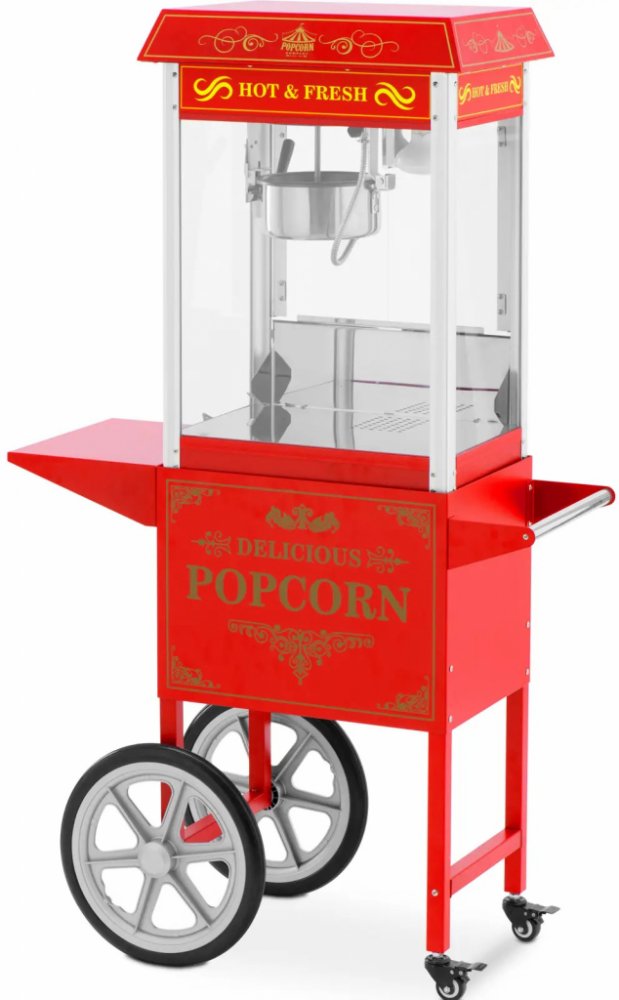 Pro mobilní použití má vozík na popcorn dvě velká a dvě malá kolečka, která se otáčejí o 360° a jsou opatřena brzdou. Praktická spodní skříňka nabízí dostatek prostoru - například pro dodávané nádobí, jako je odměrka a praktická naběračka na dávkování. Nebo zde můžete uložit přísady, jako jsou kukuřičná zrna, olej, sůl a koření, a mít tak všechny potřebné ingredience vždy po ruce. Estetický design vozíku také přitahuje pozornost zákazníků a vizuálně vylepšuje vaši stanici s občerstvením.