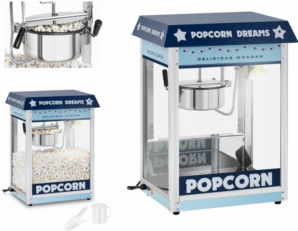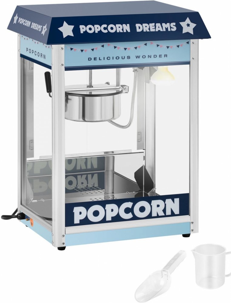 Modrý stroj na popcorn je praktickým poutačem na každém eventu Stroj na popcorn značky Royal Catering byl speciálně navržen pro použití v profesionální gastronomii a neskutečně poutá pozornost zákazníků. Nevyniká jen svým modrým pouzdrem, nýbrž také ohřívanou a krásně osvětlenou komorou, míchacím systémem a automatickým termostatem. Přesvědčte se o výhodách stroje na popcorn RCPS-BB1 a vychutnejte si skvělou atmosféru v kině, na trhu nebo festivalu! Se strojem na popcorn značky Royal Catering je vynikající popcorn samozřejmostí! Stroj pracuje s 1600 W a díky vysokému výkonu a automatickému termostatu rychle dosáhne provozní teploty mezi 220 a 270 °C. Díky vysokému výkonu lze vyrobit přibližně 16 l popcornu za hodinu (cca 5 až 6 kg/h) . Teflonová úprava hrnce zajišťuje, aby se popcorn na kotlíku nepřipékal a nepřipaloval. Hrnec má průměr 18,5 cm a je vyjímatelný, což usnadňuje čištění. Tento stroj je z velk nápadný vzhled – díky modrému retro designu výkon – díky 1 600 W do 5 až 6 kg popcornu za hodinu komfort – práce kdykoli díky osvětlení komory snadná údržba – díky, teflonu, ušlechtilé oceli a promyšlenému designu včetně příslušenství – součástí dodávky jsou odměrka a lopatka