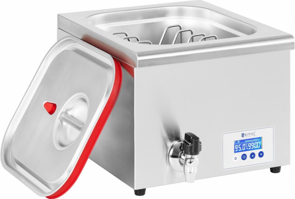 Chcete připravovat vakuově balené potraviny šetrným způsobem? Pak se rozhodněte ještě dnes pro sous-vide hrnec RCPSU-500 značky Royal Catering ze sortimentu potřeb pro gastronomii! Je vhodný pro profesionální použití v hotelovém průmyslu, v restauracích nebo pro poskytovatele stravovacích služeb i pro domácí vaření. Energeticky úsporný pomalý hrnec dosáhne rychle požadované teploty díky 500W topnému tělesu. To lze přesně nastavit v rozsahu 30–95 °C s přesností 0,1 °C. Integrovaný digitální termostat zaručuje konstantní teplotu během procesu vaření. Díky širokému rozsahu nastavení lze přístroj použít k přípravě široké škály jídel. 16litrový hrnec je obzvláště vhodný pro komerční využití v restauracích, bistrech a barech, protože velký objem umožňuje časově přesnou přípravu většího množství jídla. Intuitivní časovač, který lze nastavit na minutu přesně, disponuje rozsahem 1 min – 99 h. Všechny konfigurace lze kdykoli jasně přečíst na LCD displeji. Plášť hrnce sous-vide je vyroben ze snadno čistitelné ušlechtilé oceli. Kromě toho je tento materiál obzvláště odolný a disponuje dlouhou životností. Víko s integrovanou rukojetí a odtokovým kohoutem zajišťují dodatečné pohodlí při šetrném vaření metodou sous-vide.