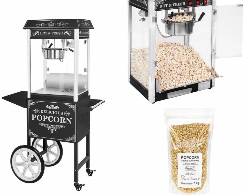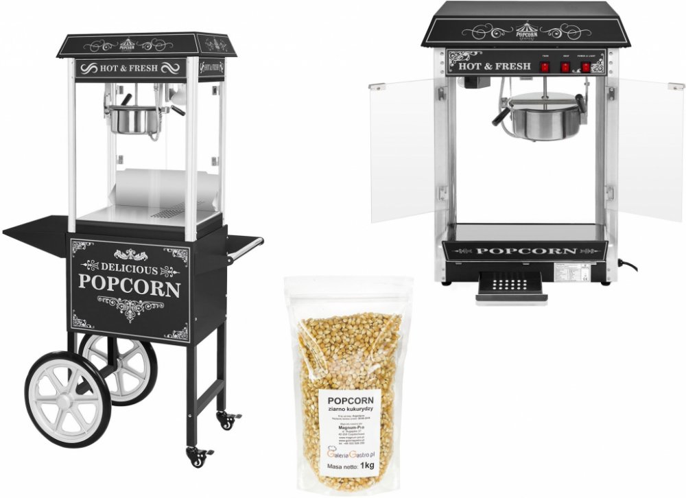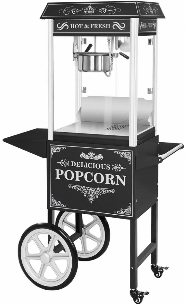 Stroj na popcorn RCPW-16.2 od RC je určen především na profesionální použití a ihned upoutá pozornost svým designem, ať ho používáte kdekoliv. Zaujme nejen svou vyhřívanou deskou na dně a výkoným topným elementem, ale také svým speciálním americkým designem. Se strojem v jednoduché černé barvě a americkým retro designem se budete odlišovat od většiny a nadchnete nejenom milovníky popcornu.Provedení stroje na popcorn je z vysoce kvalitního, potaženého železa a dá se jednoduše čistit. Díky integrovanému, vysoce výkonnému topnému tělesu, které pracuje s 1600 watty, se stroj rychle vyhřeje na provozní teplotu a je připraven k použití. Výkon zařízení je zhruba 16 litrů popcornu za hodinu (odpovídá cca 5 kg popcornu za hodinu).Odnímatelný hrnec z hliníku má průměr 18,5 cm. Díky vysoce kvalitnímu teflonovému potažení se zabrání spalování popcornu. K tomu se ještě snadno čistí a dá se tak rychle znovu použít.Díky velkým deskám z tvrzeného skla a vestavěnému osvětlení popcorn obzvláště vynikne. Atraktivní, kultovní americký retro design s nápadnými samolepkami, které se neroztaví ani při nejvyšších teplotách, přiláká pozornost všech kolemjdoucích a potěší milovníky popcornu na každé společeneské akci. S nápadným černým designem vozíku a kontrastním zdobením se budete odlišovat od většiny a ohromíte tak své zákazníky.Díky vozíku můžete stroj na popcorn kdykoliv mobilně použít. Přední, velká kola zaručují stabilitu stroje, zatímco menší zadní kola lze otáčet o 360 °, čímž je usnadněno řízení. Dvě parkovací brzdy podpoří bezproblémový provoz při používání stroje. Díky gumovému potažení koleček je možné s vozíkem lehce a tiše pohybovat. Servírovací lišta na stranách vozíku zajišťuje obzvláště snadné odebrání a porcování popcornu. Na spodní straně stroje se nachází úložný prostor ve vozíku, kde může být odložen hotový popcorn a poté jednoduše rozdán zákazníkům. Tím ušetříte čekací dobu hladových zákazníků.Při nákupu stroje na popcorn RCPW-16.2 obržíte zdarma vhodné základní vybavení. Sada příslušenství se skládá z lopatky a odměrky a je tak ideálním doplněním ke stroji na popcorn, protože Vám umožní ihned začít s výrobou popcornu. Praktická lopatka je ideální na naplnění odměrky, pytlíků nebo samotného stroje na popcorn. Odměrka má objem 0,5 litru a pomáhá při odměřování oleje, cukru nebo kukuřičných zrn. Příslušenství je vyrobeno z plastu a může být rychle a snadno vyčištěno.Speciální design strojů na popcorn od RCTento stroj na popcorn oslní nejen svou funkčností a vysokým výkonem, ale především svým neobvyklým designem. Je napodobeninou přístrojů na amerických jarmarcích a dělá tak dojem amerického životního stylu při každé společenské akci.Široká škála strojů na popcorn od RC nabízí různé designové návrhy. Tak jsou stroje na popcorn k dispozici jak v černé (model RCPW-16.2), tak v nápadné červené (model RCPW-16.3). Také horku odolné samolepky zdobí mnoho z našich modelů, například stroje na popcorn RCPW-16.1 a RCPR-16.1.Mnoho dalších, obzvláště vybavených modelů zaceluje produktovou paletu a nadchne nejen milovníky popcornu. Vystupte při koupi popcornu z davu a nadchněte Vaše zákazníky chutným popcornem z barevného stroje na popcorn.