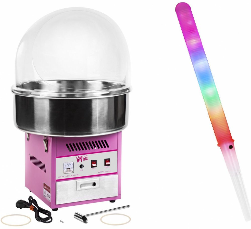 Stroj na cukrovou vatu v sadě s LED svítícími tyčinkami - 52 cm - 1 200 W - ochranný kryt - 50 ks Koupí stroje na cukrovou vatu v sadě RCZK-1200E SET1 získáte vše, co je potřeba k bezpečné a zároveň efektní výrobě a prodeji cukrové vaty. Stroj na cukrovou vatu výrobce Royal Catering je ideálním pomocníkem na festivalech, poutích, v zábavních parcích, v kině, na pouličních slavnostech a mnoha další...