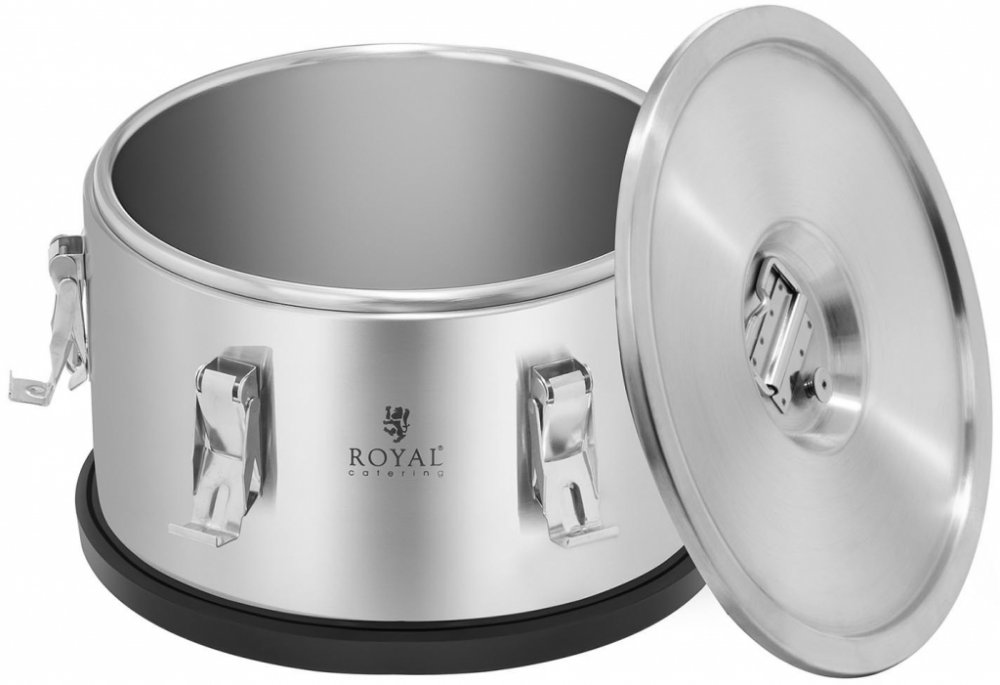 Termo nádoba RCTP10 od Royal Catering vám zaručuje bezpečný a snadný převoz horkých a studených pokrmů a nápojů. Tento zásobník je určen pro stravovacích zařízení vyšší třídy - ať už restaurace a hotely nebo velká stravovací zařízení, kantýny, catering nebo dodávkovou službu. Pokud ve vaší kuchyni oceňujete funkčnost, odolnost a atraktivní design, pak je tato izolovaná stohovatelná termo nádoba o objemu 10 litrů nepostradatelným pomocníkem pro váš kuchařský tým. Zařízení RCTP10 nabízí kapacitu 10 litrů. Termo nádoba včetně dna je vyrobena ze žáruvzdorné ušlechtilé oceli s dvojitou stěnou. Mezi oběma stěnami z nerezové oceli se nachází 15 mm silná izolační vrstva. Díky izolaci dvojitou stěnou si potraviny a nápoje udržují svoji teplotu až po dobu šesti až osmi hodin, přičemž teplota klesá až následně. Odnímatelné víko z chromniklové oceli je rovněž vybaveno dvojitou izolační stěnou, čímž podporuje delší udržení teploty potravin či nápojů uvnitř nádoby. Víko je vybaveno šesti upínacími uzávěry, které se snadno obsluhují. Díky silikonovému oděru odolnému těsnícímu kroužku, který je zabudovaný ve víku, zůstává termo nádoba během přepravy neprodyšně uzavřena. Dále je víko vybaveno odvzdušňovacím ventilem, který umožnuje vypouštět horkou páru během přepravy horkých potravin ještě před otevřením víka. Aby bylo zajištěno uživatelsky co nejbezpečnější použití odvzdušňovacího ventilu, lze výpustný ventil obsluhovat pouze pomocí speciálně tvarovaného úchytu na víku. Za účelem nenáročného ovládání a rychlého čištění je plnící otvor nádoby co největší. Nádoba disponuje dvěma ergonomickými rukojeťmi, které rovněž usnadňují její přepravu. Spodek nádoby je pokryt flexibilní plastovým kroužkem. Ten zajišťuje stabilní umístění na hladkých površích a chrání nádrž před poškozením. Rovněž umožňuje pohodlné a bezpečné skládání několika nádrže na sebe, neboť víko a kroužek z umělé hmoty do sebe skvěle zapadají. Díky prvotřídnímu zpracování kartáčované ušlechtilé oceli vyniká RCTP10 také co se týče hygieny. Povrch nádrže je odolný vůči znečištění, jako je rez, vodní skvrny, koroze nebo zbytky jídla. Potraviny si uchovávají svoji skutečnou chuť a vůni. Vysoce kvalitní zpracování umožňuje snadnou údržbu a čištění termo nádoby. Prohlédněte si také další transportní nádoby z této řady, jež jsme pro vás připravili. Použitím nádrží jednotného průměru 30 cm lze jednotlivé nádrže o objemu 15, 20, 25 a 35 litrů poskládat perfektně do sebe a to v různých kombinacích.