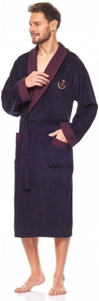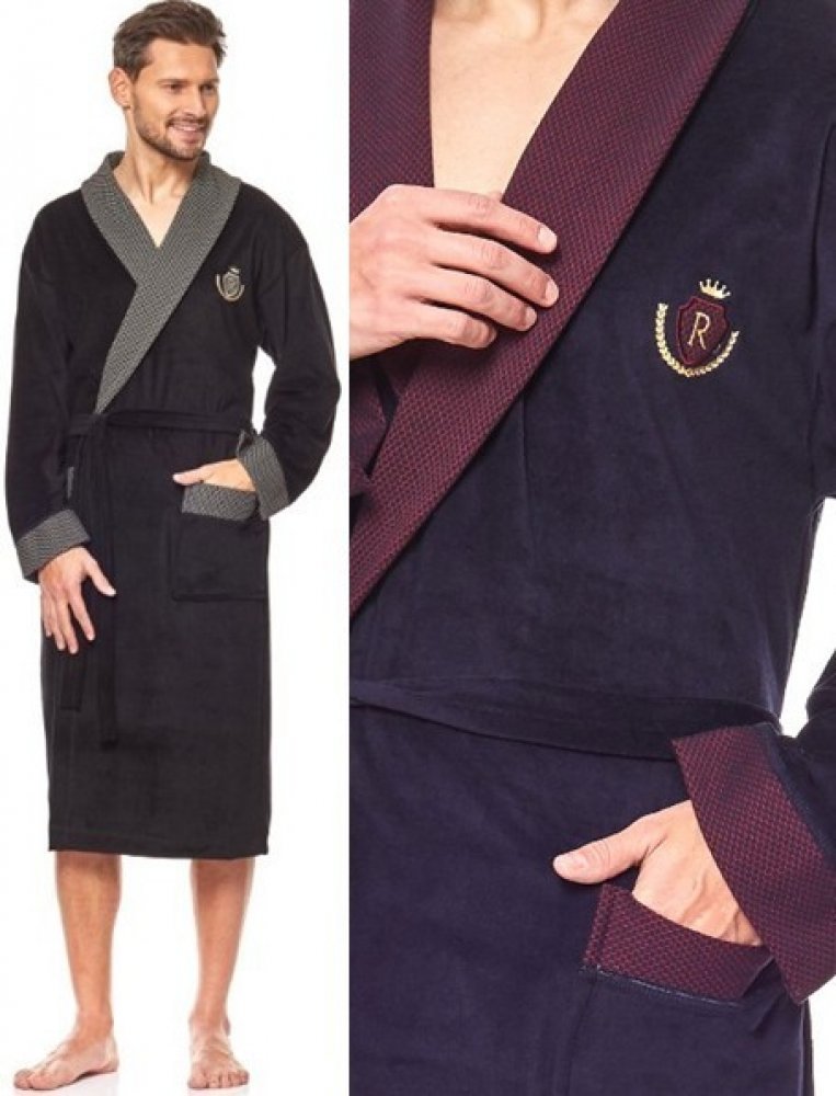 Pánský dlouhý velurový župan, v nadměrných velikostech až do 4XL. Župan je se šálovým límcem, s uvazováním v pase a dvěmi kapsami. Manžety na rukávech, kraje kapes a límec jsou kontrastní, vzorované. Na prsou malá ozdobní aplikace - erb s písmenem R a korunkou - Royal.