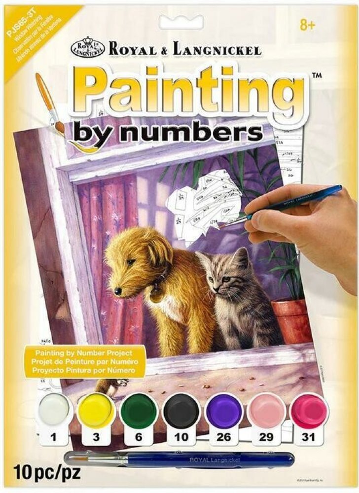 Malování podle čísel 22x30 cm - Pes v okně Balení obsahuje předtištěný obrázek s čísly - na tvrdém kartonu, předtištěný obrázek jako kopii, 7 barev, štětec. Postup: Obrázek je rozdělen na jednotlivá číselná políčka, barvy mají také čísla a jen vybarvujete políčka podle čísel. Vyberte si barvu a jejím číslem vybarvěte označené políčko. Do políček označených zlomek se barvy namíchejte. Např. 2/6 - smícháte stejné množství barvy 2 a 6. U zlomku 2 2/6 smícháte dva díly barvy 2 a jeden díl barvy 6. Pokud je barva velmi hustá, nařeďte jí kapkou vody. Při změně barvy štětec pořádně vyperte. Po zaschnutí jsou barvy voděodolné.Doporučujeme začít obrázek malovat od shora, abyste si ho svojí vlastní rukou nerozmazali.