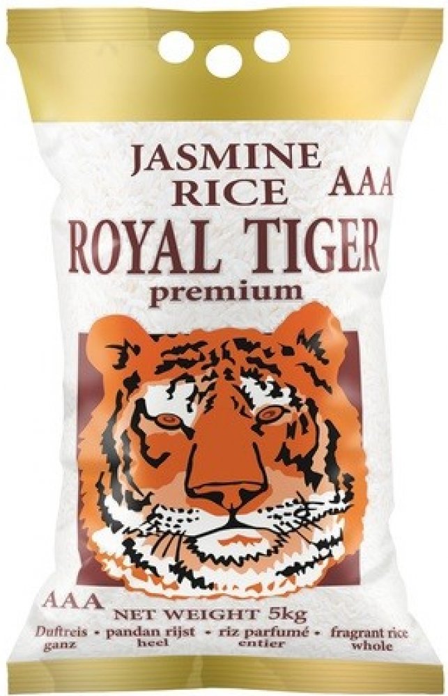 Jasmínová rýže Jasmine Rice Royal Tiger (thajská voňavá rýže) je nejkvalitnější dlouhozrnná bílá jasmínová rýže, pěstovaná především na indočínském poloostrově. Je běžně nazýván thajskou voňavou rýží (Thai fragrant rice) nebo pandanovou rýží díky své jemné, přirozené květinové vůni. Po uvaření jsou zrna nadýchaná a nelepivá, což z nich dělá ideální základ pro mnoho pokrmů. V thajské kuchyni má uklidňující roli a vyrovnává intenzivní chutě kari a ostrých omáček.