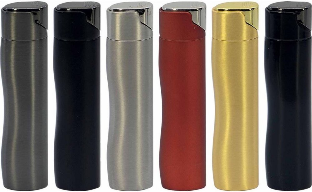 Elegantní zapalovač Royce ve tvaru vlnky. Kovový tryskový zapalovač s broušeným povrchem v různém barevném provedení. Po stisknutí tlačítka se horní část zapalovače odklopí a tryska zapalovače se zapálí. Plamen má zelenou barvu.
