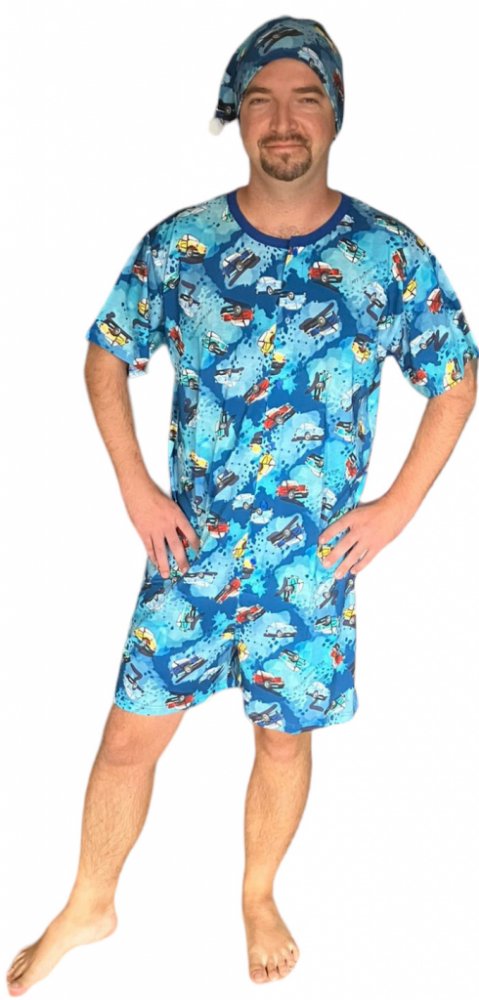 Rozárka P50 auta pánský overal na spaní s čepičkou krátký sv.modrý