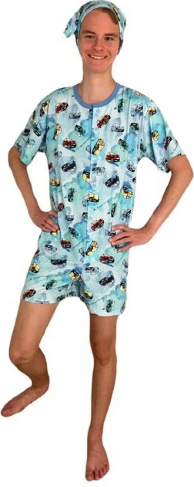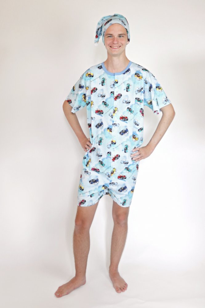 Overal na spaní s čepičkou. Overal má krátký rukáv, krátké nohavice, kulatý výstřih a rozepínání na knoflíky. K overalu je dodávána čepička s bambulkou. Overal je ve světle modré barvě a má obrázky s auty.