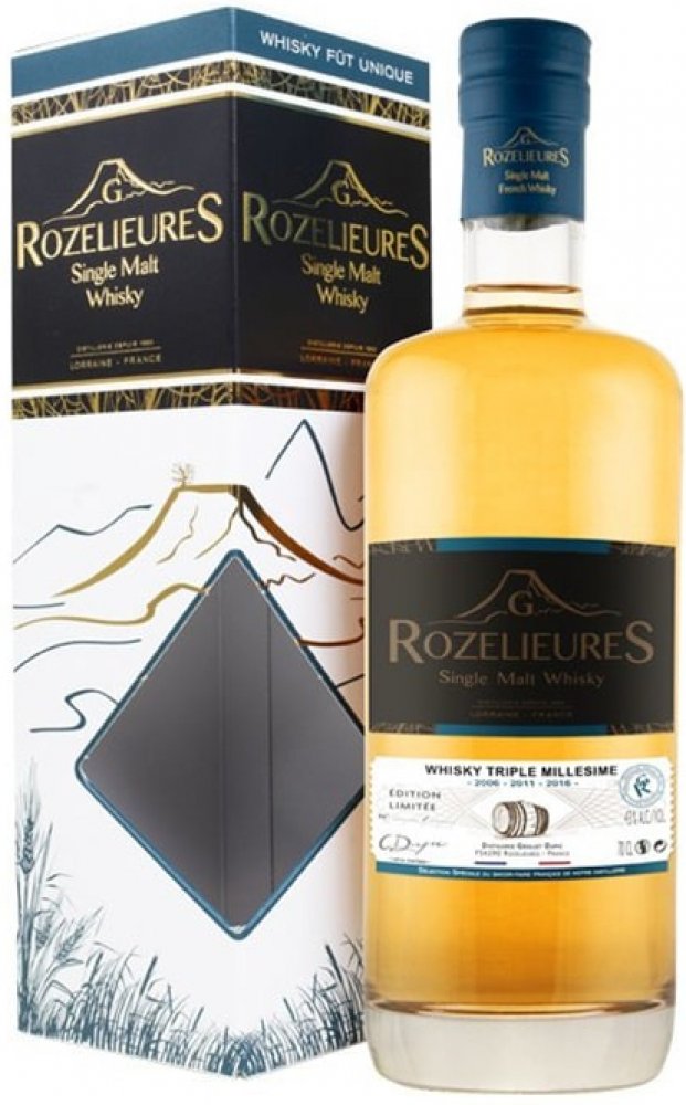 Rozelieures Triple Milessime 2006/2011/2016 je opravdový klenot – vzácné rodinné stříbro. Jedná se o jedinečný blend toho nejlepšího ze tří výjimečných ročníků 2006, 2011 a 2016 této ceněné prémiové francouzské single malt whisky. Unikátní výrobní know-how této rodinné destilérky se projevuje v kombinaci několika druhů sudů použitých ke staření (po bourbonu, cognacu a také v čerstvých sudech z francouzského dubu "virgin oak barrels"), umístěných ve sklepech s odlišnými podmínkami jako je teplota a vlhkost. Tato vzácná limitovaná edice s výraznějším rašelinovým charakterem (36ppm) patří k tomu nejlepšímu, co aktuálně značka Rozelieures nabízí. Byla vyrobena v množství pouhých 719 láhví pro celý svět, a proto je dostupná do vyprodání omezených zásob.
