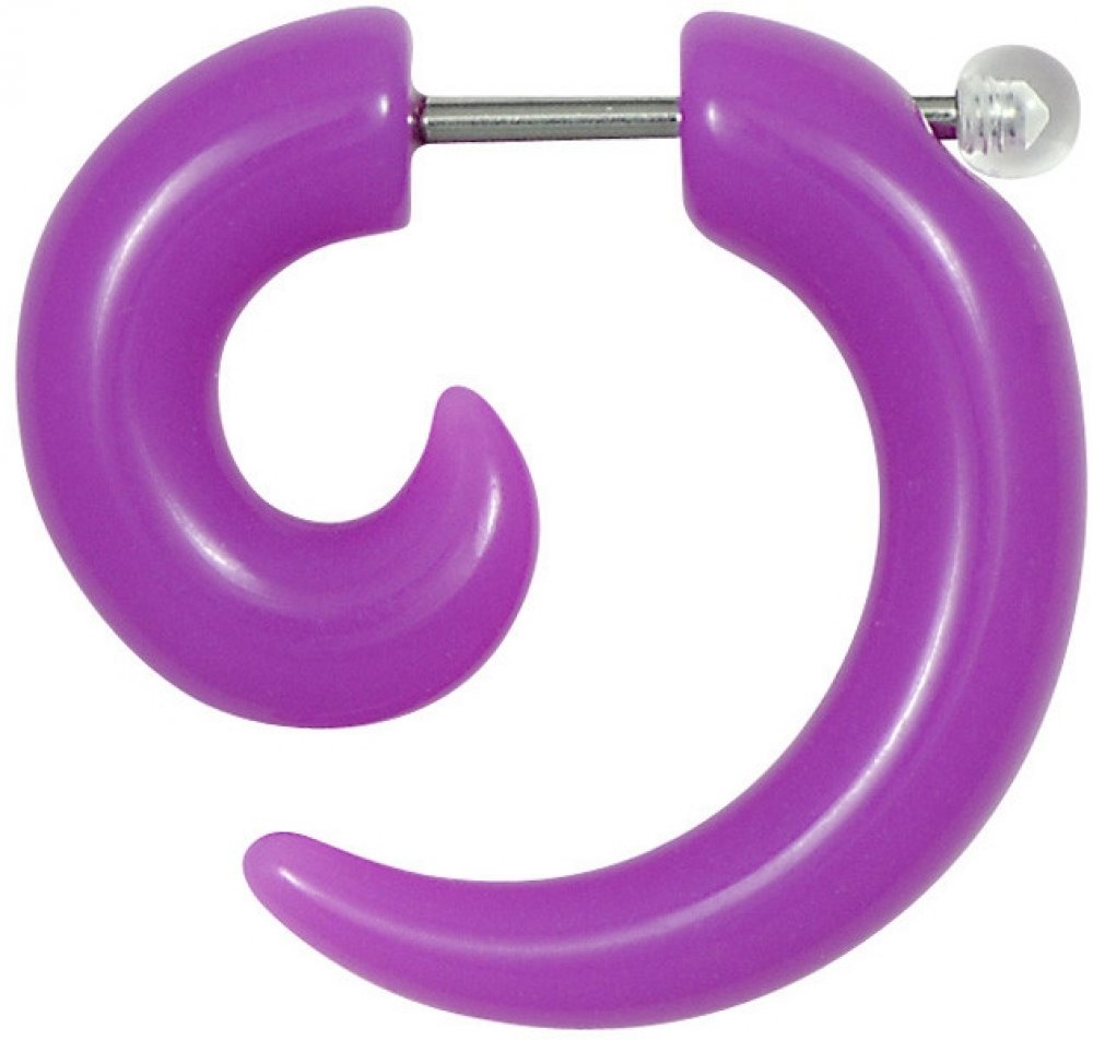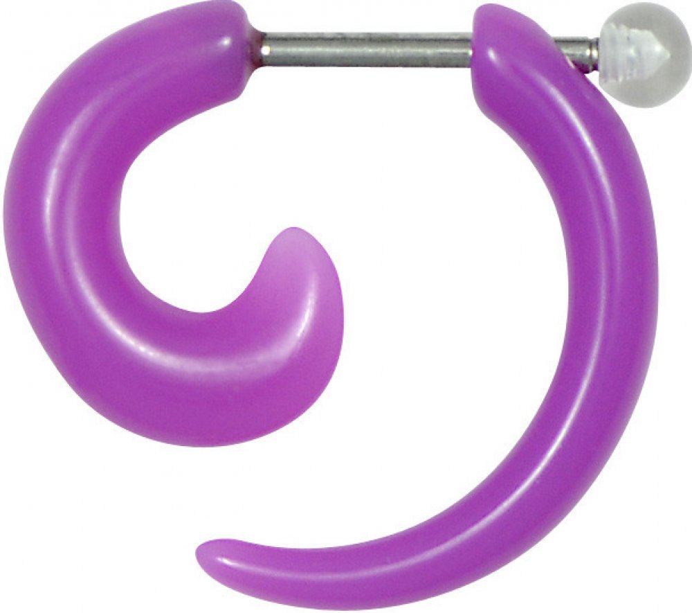 Falešný plastový roztahovák fialové barvy. Spojen je tyčkou z chirurgické ocele 316L. Upevňuje se pomocí šroubovací kuličky z plastu.