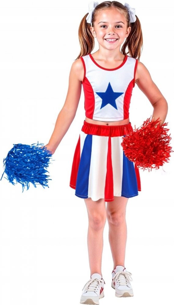 Kostým roztleskávačky v bílo-červeno-modrém provedení. Krátký top zdobený modrou hvězdou, nasazovaný přes hlavu. Sukně s širokými záhyby, na gumičce.
