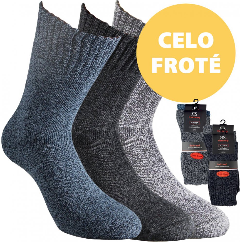 Pánské teplé a jemné melírované froté ponožky učené k běžnému nošení i pro volný čas. Klasická délka oblíbených RS ponožek - příjemně se nosí a nesjíždí! Skvěle drží díky své elasticitě a hlavně neškrtí díky příjemnému zakončení.
