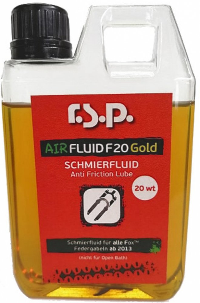 LUBRICANT RSP AIR FLUID F 20 GOLD 250ml Air Fluid je speciální mazivo pro odpružené vidlice a tlumiče Fox od modelového roku 2013 a pro kazety s označením FIT a O/C. Viskozita 20WT Snižuje tření, chrání těsnění před opotřebováním a zabraňuje pěnění maziva. Díky přidaným aditivům má Air Fluid extrémně dlouhou životnost bez potřeby výměny, má antikorozní vlastnosti a jeho viskozita není ovlivněna venkovní teplotou. Upozornění - dodržujte doporučení výrobce zavěšení týkající se objemu a aplikace maziva.