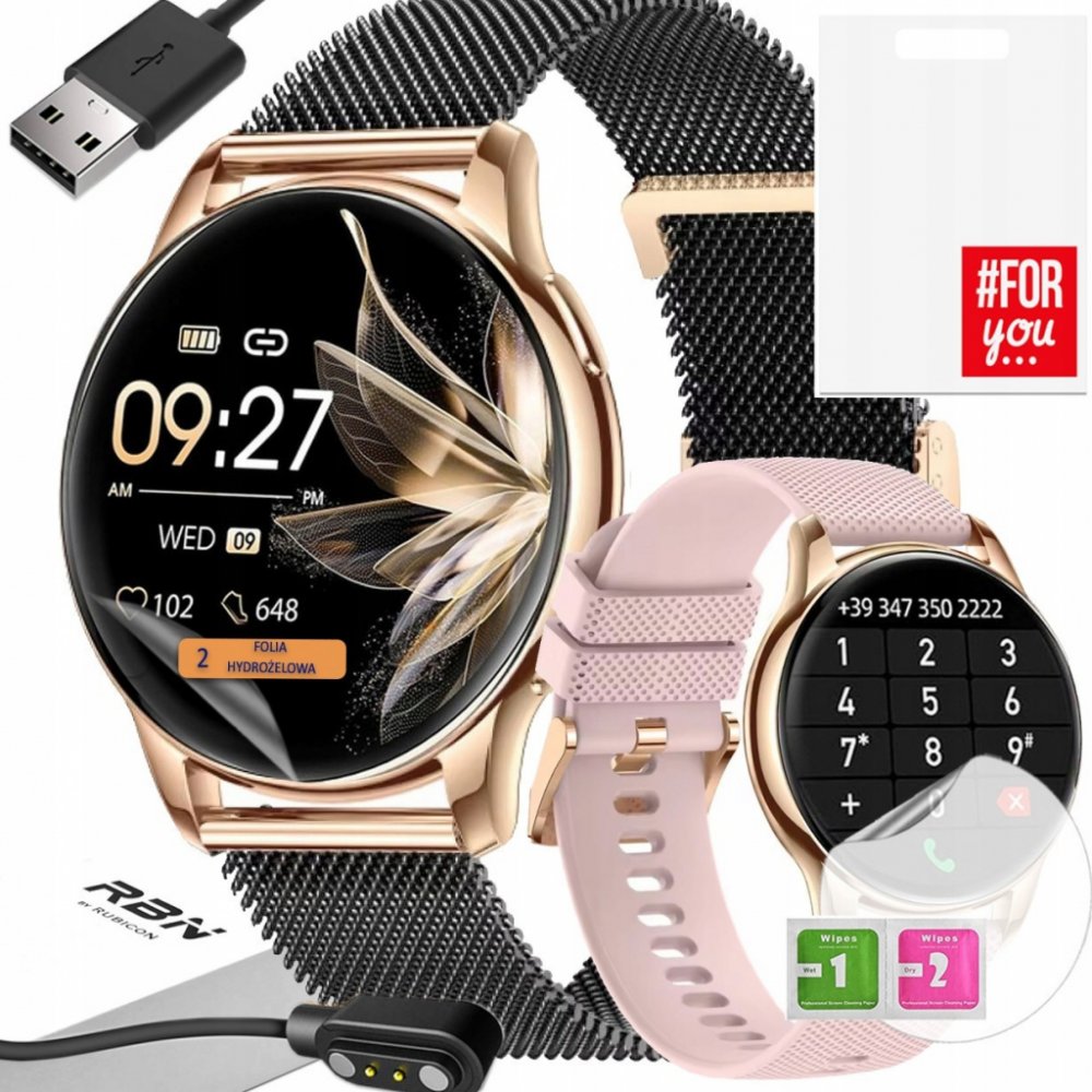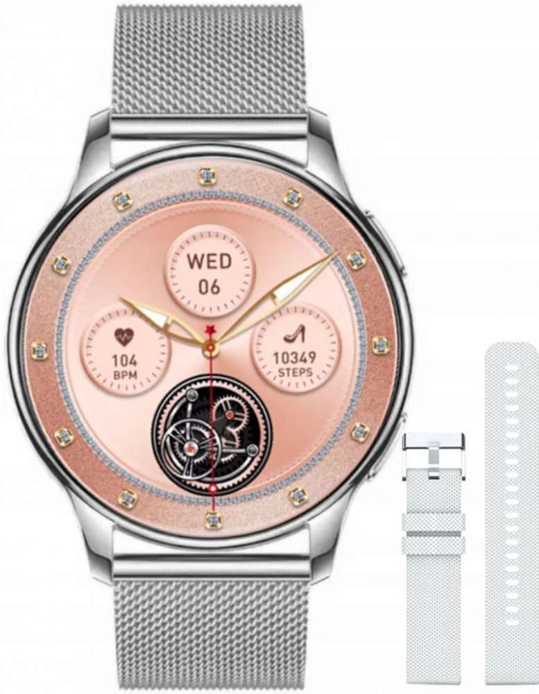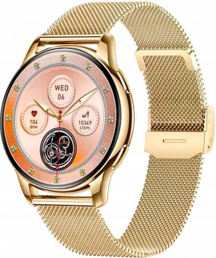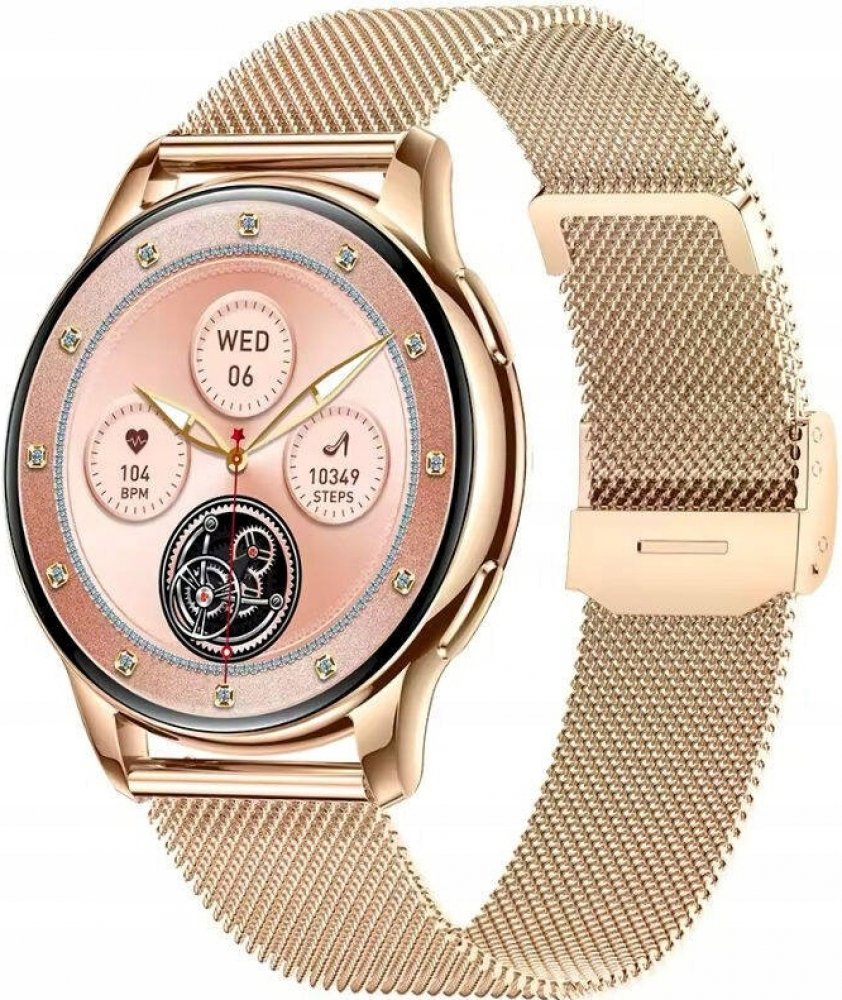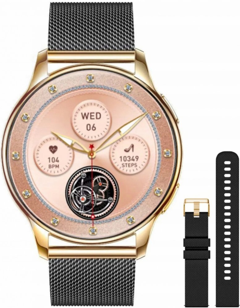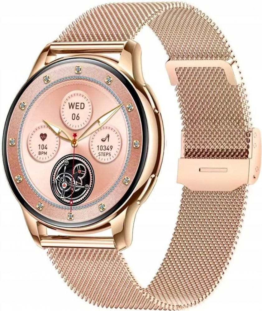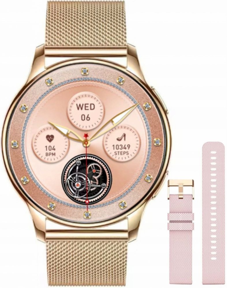 Rubicon RNCF30 ve verzi s náramkem v barvě růžového zlata je dámský chytré hodinky s AMOLED displejem a funkcí hovoru, který je součástí balení a má navíc růžový řemínek.