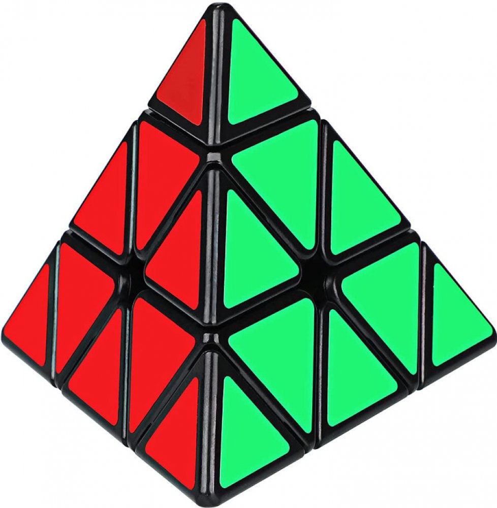 Pyraminx Magic Cube černý s lesklými barevnými nálepkami.