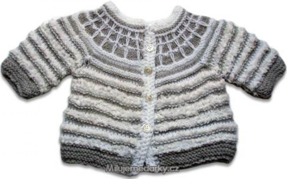 Ručně pletený dětský svetřík bílo šedý pruhovaný, celopropínací se sedlem ve tvaru kostek, pruhy jsou ze silnější vlny, svetr je velmi měkký