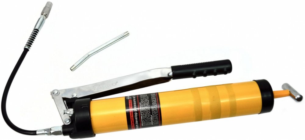 Profesionální ruční mazací lis o objemu 900 ml a sadou příslušenství.