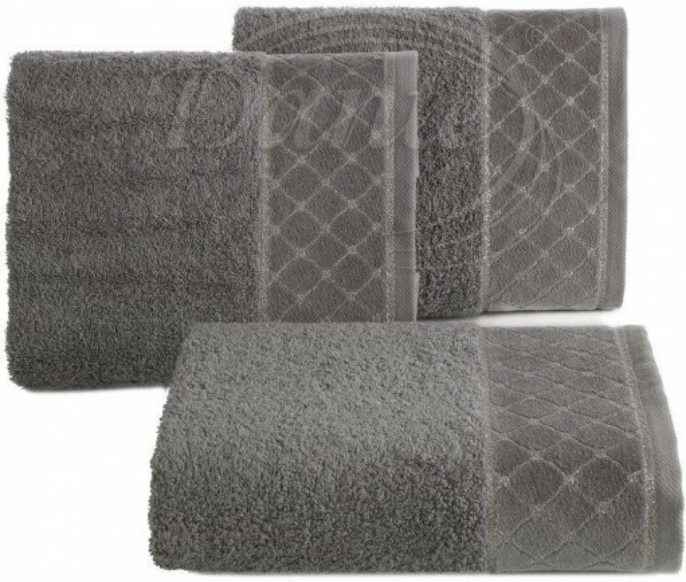 Měkké a nadýchané ručníky tmavě šedé barvy ve spodní části zdobené velurovým pruhem protkávaným stříbrnou nití.
