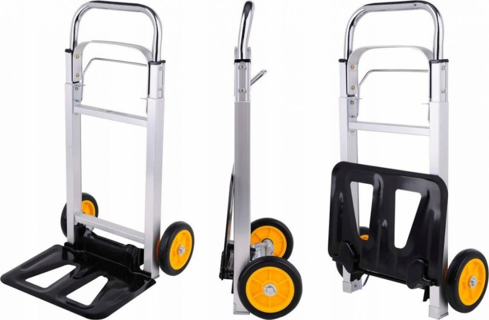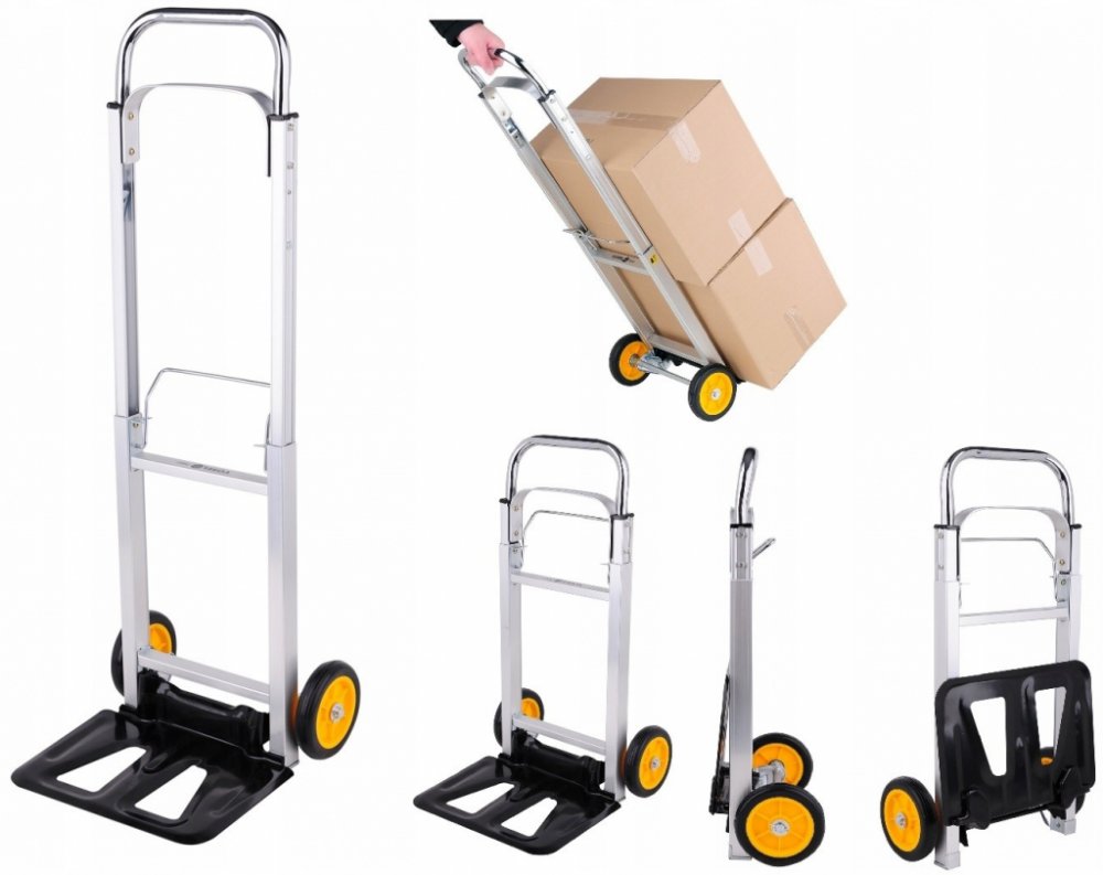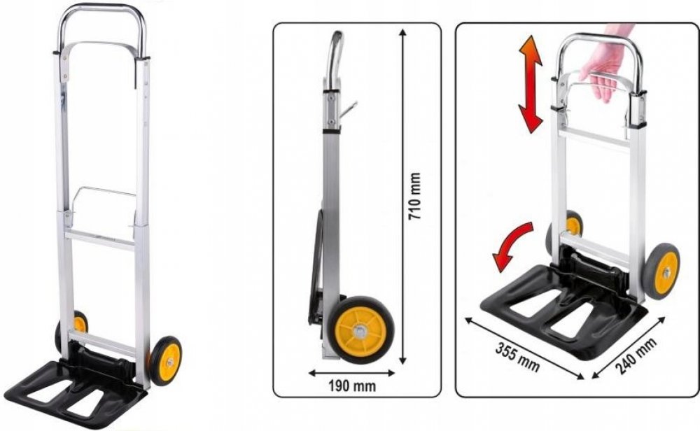Skládací vozík s nosností 90kg a velkou deskou pro náklad například kartonů, krabic apod. Teleskopický úchyt s uzamykacím systémem, který je v rozloženém stavu vysoký 1,08 metru značně usnadňuje dopravu nákladu bez nadměrného úsilí. Složený vozík o rozměrech jen 19 x 39 x 71cm lze jednoduše umístit například do kufru auta.