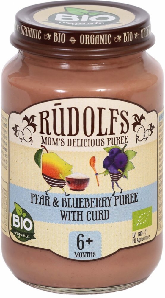 Rudolfs BIO Hruška, borůvky, tvaroh je dětský příkrm v BIO kvalitě určený pro zvláštní výživu kojenců a malých dětí od ukončeného 6. měsíce. Ovoce obsažené v příkrmu je vhodným zdrojem vlákniny pro kojence a batolata. Příkrm dodá dětem potřebnou energii, vitamíny a minerální látky.