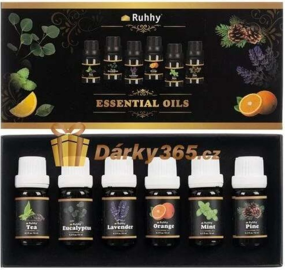 6 RŮZNÝCH VŮNÍ – celá sada má 6 různých vůní jako: eukalyptus, pomeranč, čajovník, máta, levandule a borovice. Vše oleje jsou uzavřeny v lahvičkách o objemu 10 ml .