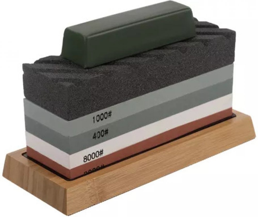 5 DRUHŮ KAMENE + KŮRA - broušení nože na vodním kameni vyžaduje, aby byl kámen před použitím na krátkou dobu ponořen do vody, což pomáhá udržovat jeho vlhkost a usnadňuje proces broušení. Existují různé stupně vodních kamenů, které určují jejich schopnost odstraňovat materiál z čepele nože. Naše sada se používá k broušení a dokončování ostří, čímž získá hladké a ostré ostří. K dispozici jsou kameny s gradací 400 / 1000 / 3000 / 8000, kámen pro vyrovnání povrchu brousku a kožená podložka pro leštění čepele. .