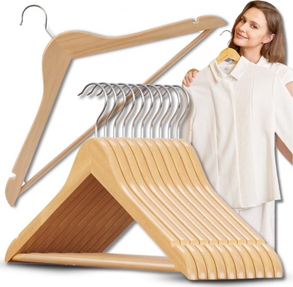 DŘEVĚNÉ VĚŠÁKY NA ODĚVY 10 KS VÝJIMEČNÁ KVALITA A ODOLNOST Sada 10 dřevěných ramínek na šaty je synonymem elegance a odolnosti, ideální pro každého, kdo si ve svém šatníku cení vysoce kvalitního zpracování. Každý věšák v ceně je vyrobena z masivního dřeva , které se vyznačuje vysokou odolností a přirozenou krásou. Dřevo bylo pečlivě pokryto bezbarvým lakem , a nejen to chrání materiál před vlhkost...