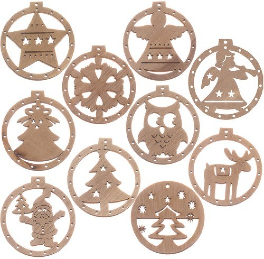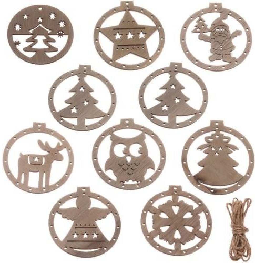 Součástí balení je 10 kusů s motivy jako je vánoční stromeček, sova, hvězda, sob a další motivy spojené s Vánocemi. Balení obsahuje provázek pro pohodlné zavěšení ozdob. Materiál: dřevo Rozměr: ozdoba 6,4 x 6,9 cm
