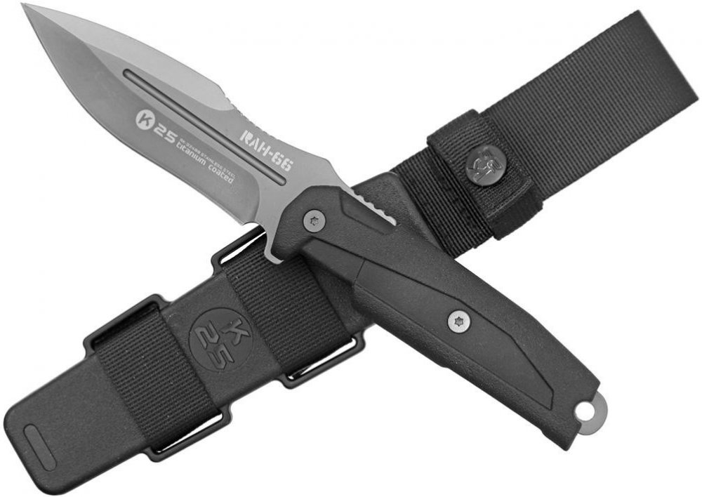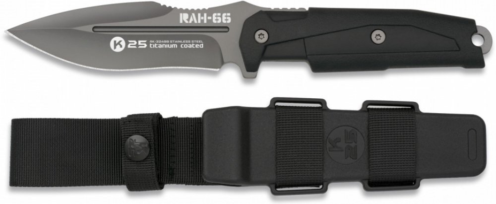 Kompaktní taktický nůž RUI Tactical 32499 RAH-66, integrální konstrukce, titanová povrchová úprava, gumová protiskluzová rukojeť, plastové pouzdro.