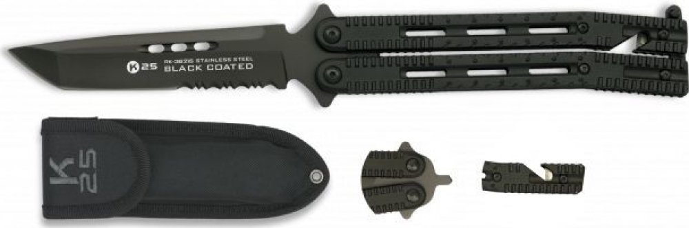 Kovový zavírací nůž, tzv. motýlek s Tanto čepelí a šedým titanovým povrchem.Vlastnosti:• otevřete ho (nebo zavřete) jednoduše překlopením dvoudílné rukojeti a zajistíte pojistkou na konci rukojeti• v rukojeti jsou podlouhlé otvory a drážky proti vyklouznutí nože z ruky• v zavřeném stavu je na konci rukojeti hrot na rozbíjení skla, z druhé strany řezač popruhů• včetně nylonového pouzdra