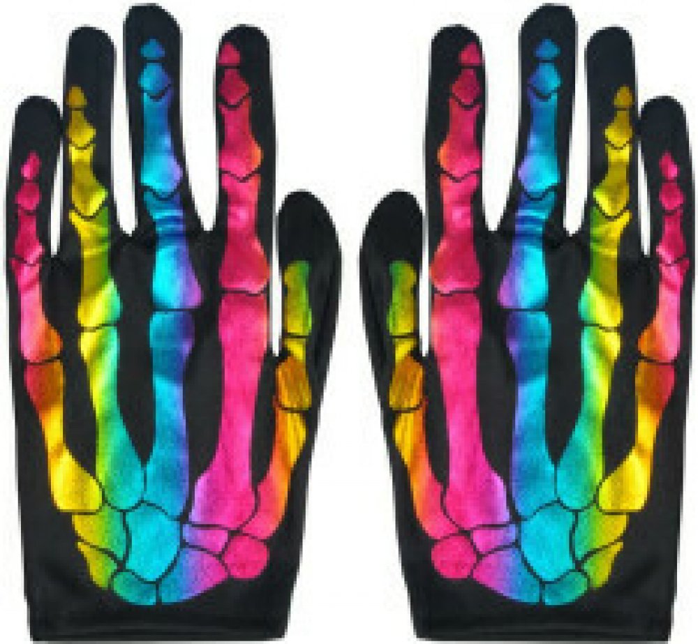 Oživte svůj kostým! Zářivé rukavice s potiskem kostí v duhových barvách dodají vašemu převleku originální šmrnc. Jsou ideální na Halloween, karneval, maškarní večírky nebo tematické párty. Díky elastickému materiálu skvěle padnou a jsou pohodlné i při delším nošení. Zaujměte svým vzhledem – ať už jdete strašit, nebo se jen bavit. Balení: 1 pár Barva: černá, duhový potisk Velikost: univerzální (22 ...