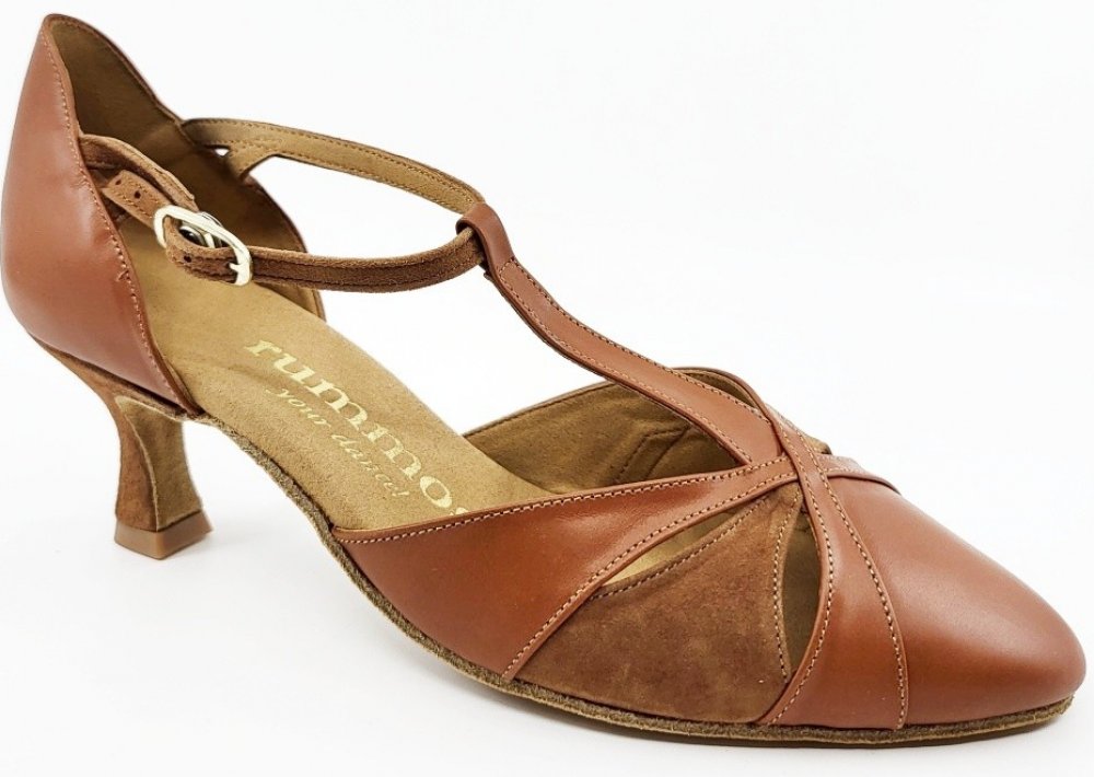 Dámská uzavřená taneční obuv s nižším podpatkem. Nadčasový střih do tvaru "T" na nártu. Decentní hnědá barevná kombinace je univerzální pro sladění jakékoli barvy tanečního outfitu. Semišová podrážka je určena pouze do vnitřních prostor.