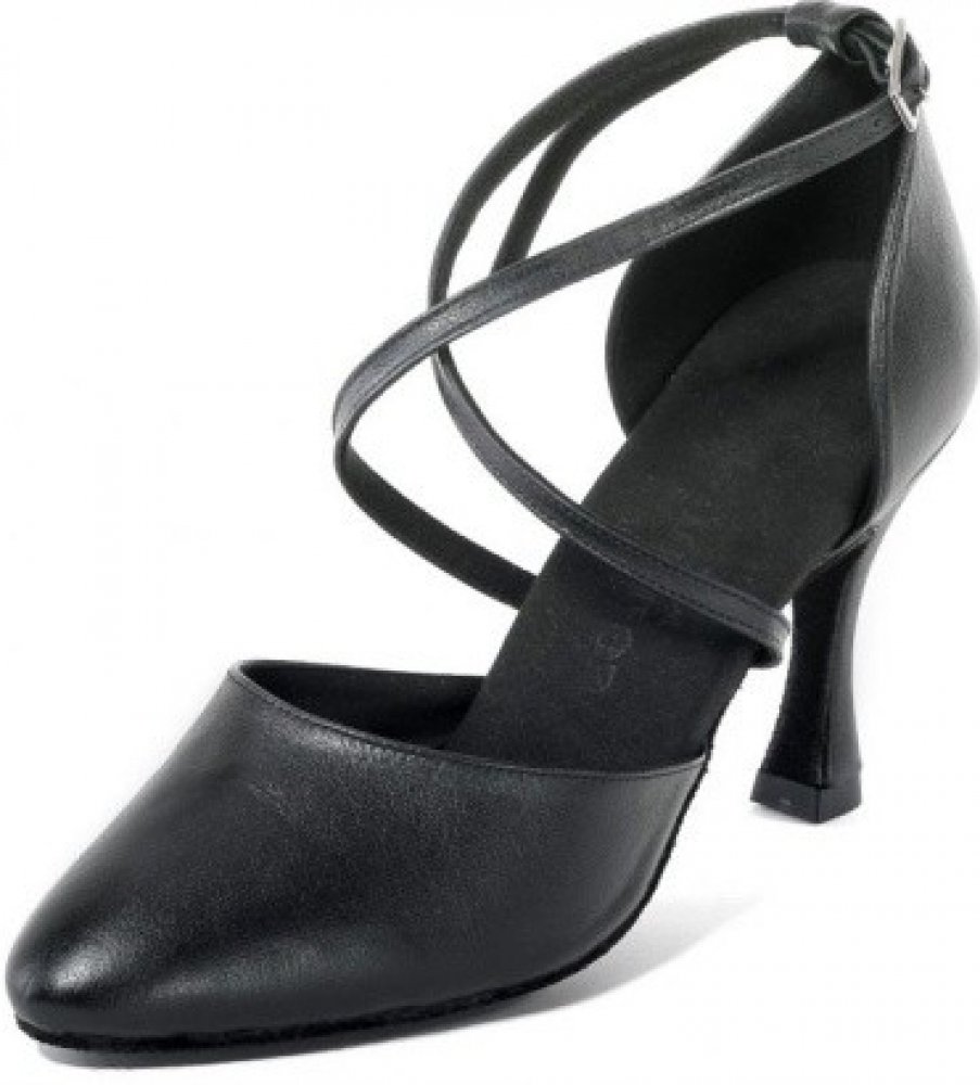 Dámská uzavřená taneční obuv z hladké černé kůže. Na výběr ze dvou variant podpatků, dle pokročilosti nebo prostě jen preferencí tanečnice. Materiál je měkká kůže, která se přizpůsobí tvaru nohy a nebude vás nijak tlačit nebo omezovat. Univerzální model pro jakékoliv taneční nebo společenské příležitosti. Semišová podrážka je určena pouze do vnitřních prostor...