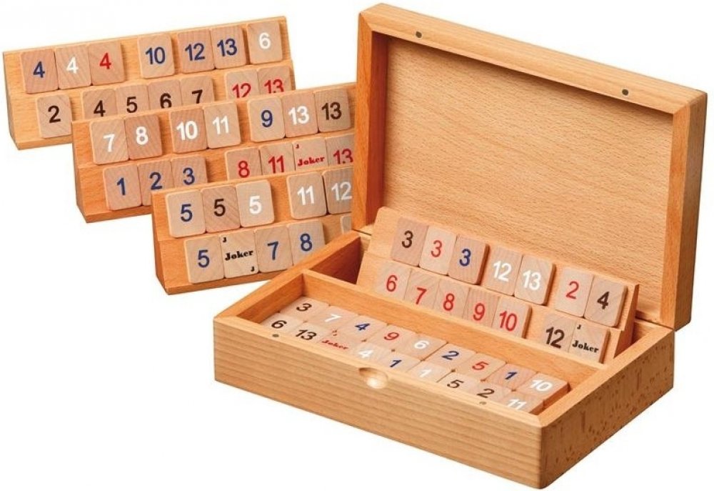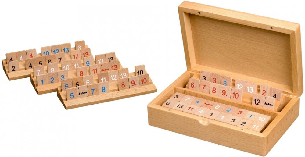 Hra Rummy, kazeta a hrací kameny ze dřeva.