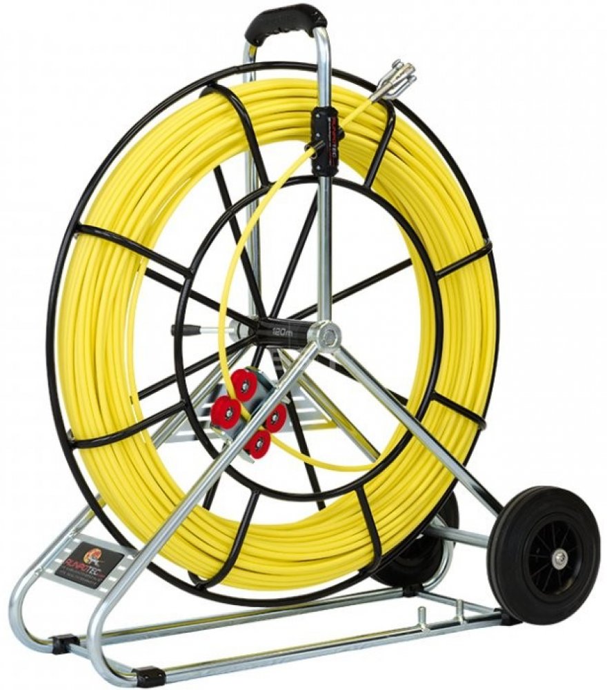 Protahovací pero ze skelného vlákna Ø 7,5 mm, včetně pojízdného nerezového navíjecího stojanu Ø 730 mm, závit RTG Ø 12 mm. Včetně příslušenství (1x pojízdný stojan, 1x počítadlo metrů, 1x karabinka, 1x pero s čepy na obou stranách). Přednosti: Kladky pro rychlé odvíjeníZrychlují odvíjení protahovacího pera ze skelného vlákna.Počítadlo metrůTvrzené vroubkované kolečko. 5místné počítadlo s rozlišením na 10 cm.Brzda odvíjeníVšechny navíjecí stojany RUNPOTEC jsou vybaveny postranní brzdou odvíjení.Zdvojený odvíjecí systém:rychlé odvíjení anebo automatická odvíjecí brzda.Zesílená kovová konstrukce nav. stojanu
