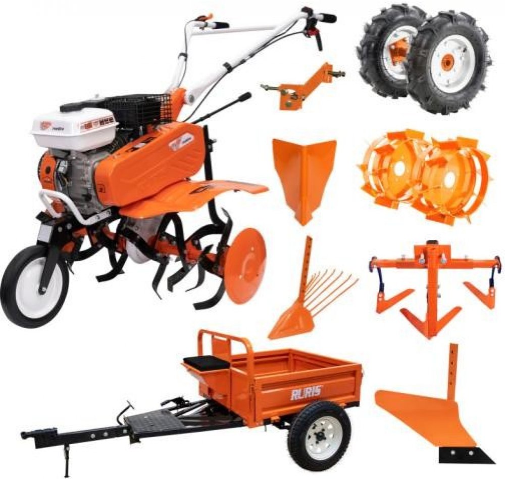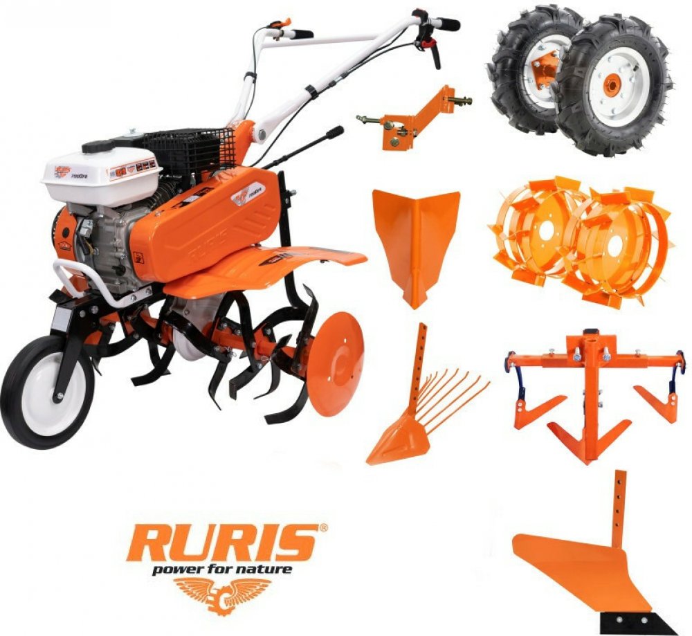 Motorový kultivátor RURIS 7000K s vlečkou RURIS 450S, nafukovacími koly 400x8 s poloosami. Dvouřadá kovová kola 400 bez poloos, plečka TS103, jednoradliční pluh, pluh na brzdu kultivátoru, vyorávač brambor, držák nářadí. Kultivační nože jsou smontovány na osách již v krabici – žádné úmorné skládání vás víc nečeká. Ke kultivátoru lze připojit bubnovou sekačku RURIS CRT570 (kód zboží: CRT570).