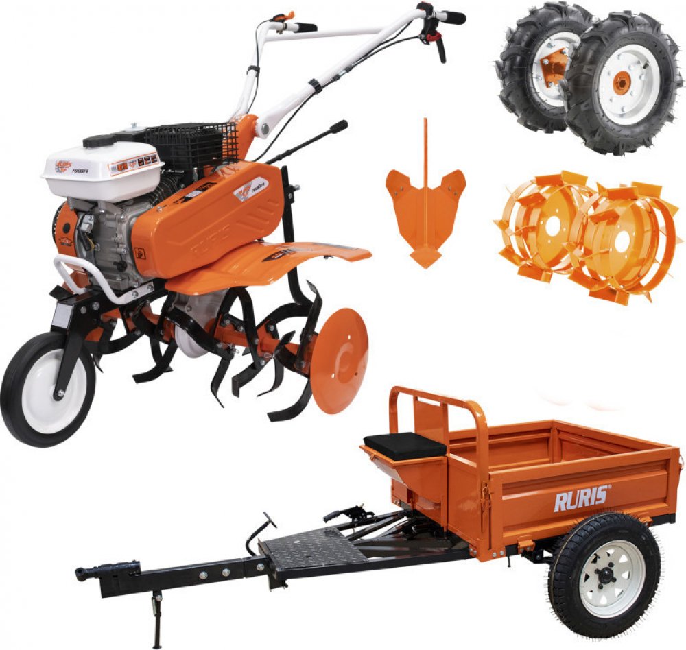 Motorový kultivátor RURIS 7000K s vlečkou RURIS 450S, nafukovacími koly 400x8 s poloosami, dvouřadými kovovými koly 350 bez poloos, pluh nastavovací. Kultivační nože jsou smontovány na osách již v krabici – žádné úmorné skládání vás víc nečeká.