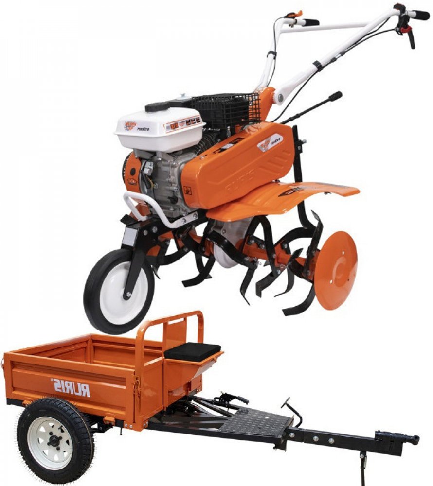 Motorový kultivátor RURIS 7000K s vlečkou RURIS 450S, nafukovacími koly 400x8 s poloosami, dvouřadými kovovými koly 350 bez poloos, pluh nastavovací. Kultivační nože jsou smontovány na osách již v krabici – žádné úmorné skládání vás víc nečeká. Ke kultivátoru lze připojit bubnovou sekačku RURIS CRT570 (kód zboží: CRT570).