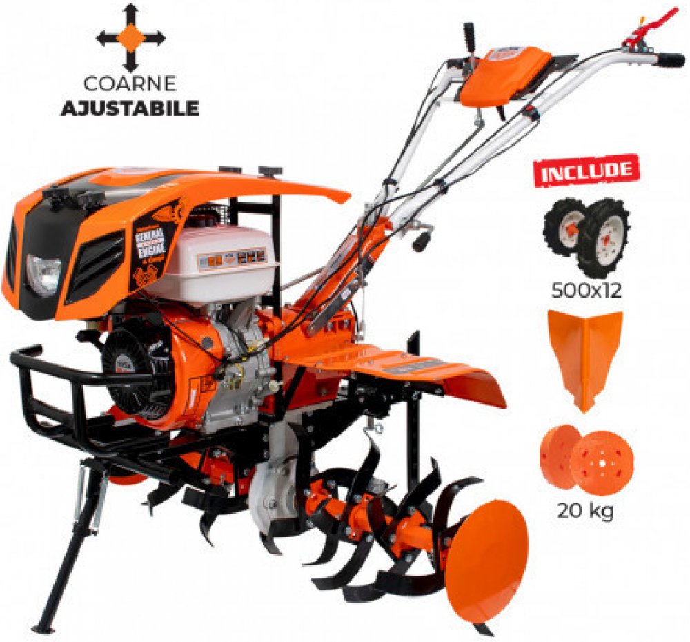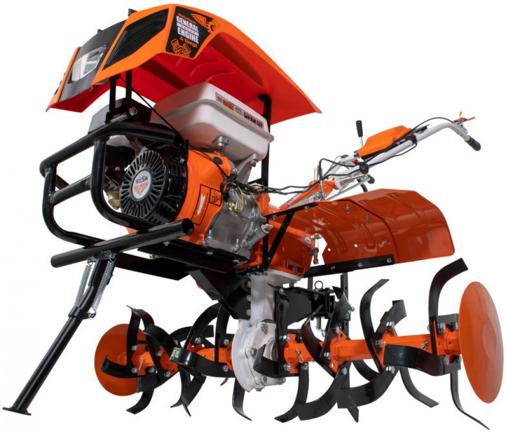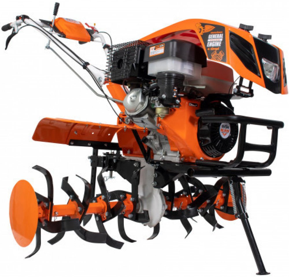 Benzínový kultivátor pro obrábění velkých ploch s motorem General Engine o výkonu 15 HP, vybavený LED osvětlovacím systémem, který umožňuje jeho použití i při zhoršené viditelnosti nebo po setmění. Pracovní hloubka může dosáhnout 360 mm a příslušenství, které je součástí balení, pomáhá při orbě, setí nebo přípravě setí. Pracuje se 3 rychlostmi, 2 vpřed a 1 vzad. Řadicí páka je umístěna na úrovni r...