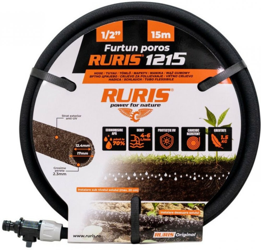Porézní hadice je efektivní a praktický nástroj pro zavlažování zahrady, ideální pro kontrolované a rovnoměrné zavlažování rostlin. Díky své speciální struktuře voda pomalu a neustále prosakuje podél celého povrchu hadice přímo k úrovni půdy, čímž se snižují ztráty odpařováním a zajišťuje hluboká hydratace kořenů. Tento typ hadice je ideální pro květinové zahrady, zeleninové záhony nebo keře, neboť pomáhá šetřit vodu a čas. Model RURIS 1215 navíc umožňuje rovnoměrné zavlažování bez stříkání, což chrání citlivé listy a květiny. Vnitřní průměr 12,4 mm a vnější průměr 17 mm poskytují optimální rovnováhu mezi flexibilitou a odolností, což umožňuje rovnoměrné dodávání vody. Použitím této hadice tak mohou zahradníci dosáhnout zdravé a dobře udržované zahrady s minimálním úsilím. Porézní hadice RURIS 1215 je ekologický model, který pomáhá šetřit vodu. Ve srovnání s konvenční metodou šetří až 70 % vody. Zároveň má ventil, který umožňuje nastavit průtok a tlak. Pórovitá hadice je vybavena základním příslušenstvím, které umožňuje její okamžité a efektivní použití. Obsahuje konektor s regulačním ventilem a adaptér na vodovodní kohoutek. Hadice je navíc vybavena také zarážkou, která zabraňuje úniku vody na konci hadice, a tím zajišťuje konstantní tlak po celé její délce. Toto příslušenství nejen zjednodušuje instalaci, ale přispívá také k efektivnějšímu a úspornějšímu využívání vody v zahradě. Se standardní velikostí 1/2" je tato hadice kompatibilní s většinou zavlažovacích systémů a zahradního příslušenství dostupného na trhu.
