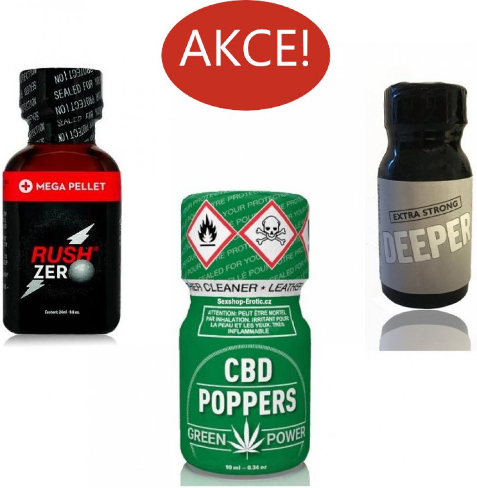 Připravili jsme pro vás zajímavý Poppers akční set, který obsahuje tři kvalitní produkty Poppers Rush CBD Green Power 10 ml, Poppers DEEPER anal penetration 13 ml, Poppers RUSH ZERO 24 ml Běžná cena 753 Kč, akční cena jen 599 Kč. Ušetříte až 154 Kč. Kupte a ušetřete! Neslouží k přímé inhalaci! Výrobky poppers se prodávají výhradně za účelem použití způsobem uvedeným na obalu a v příbalovém letáku ...