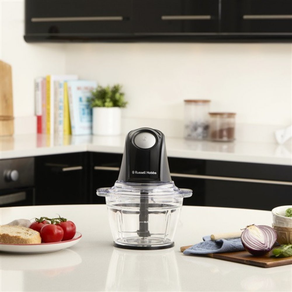 Udělejte si přípravu jídla rychlou, snadnou a jednoduchou - nechte Russell Hobbs Desire Matte Charcoal Mini Chopper udělat všechnu těžkou práci pouhým stisknutím tlačítka! /min Premiový matný design v grafitovém provedení (s černými akcenty) Skleněná mísa 1 l (pracovní objem 500 ml) NOVÁ protiskluzová základna Nerezové S-čepele Univerzální nože z nerezové oceli, vhodné pro všechny druhy potravin Části, které přicházejí do styku s potravinami, lze mýt v myčce nádobí a neobsahují BPA Součástí balení je úložné víko