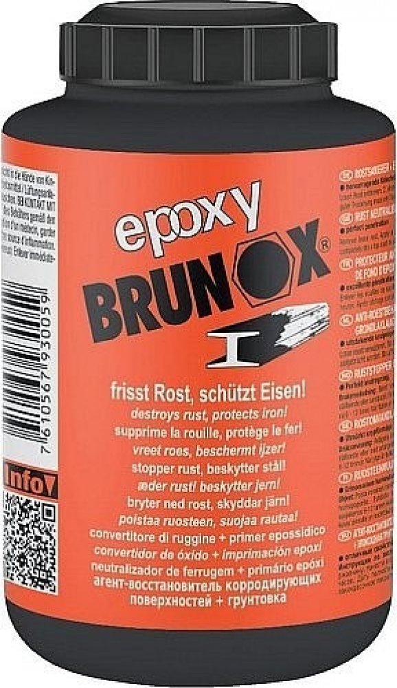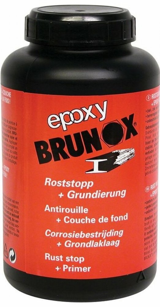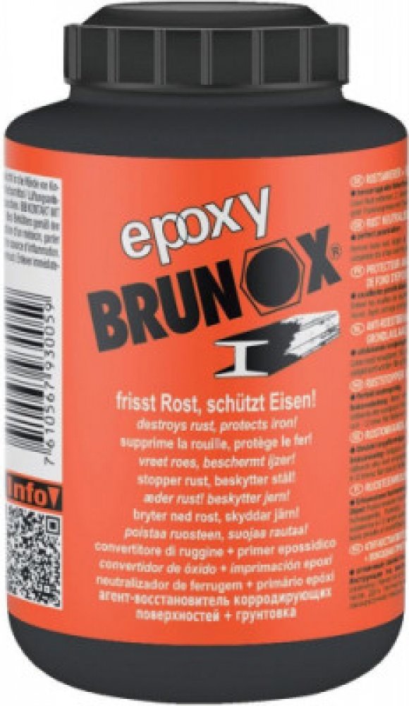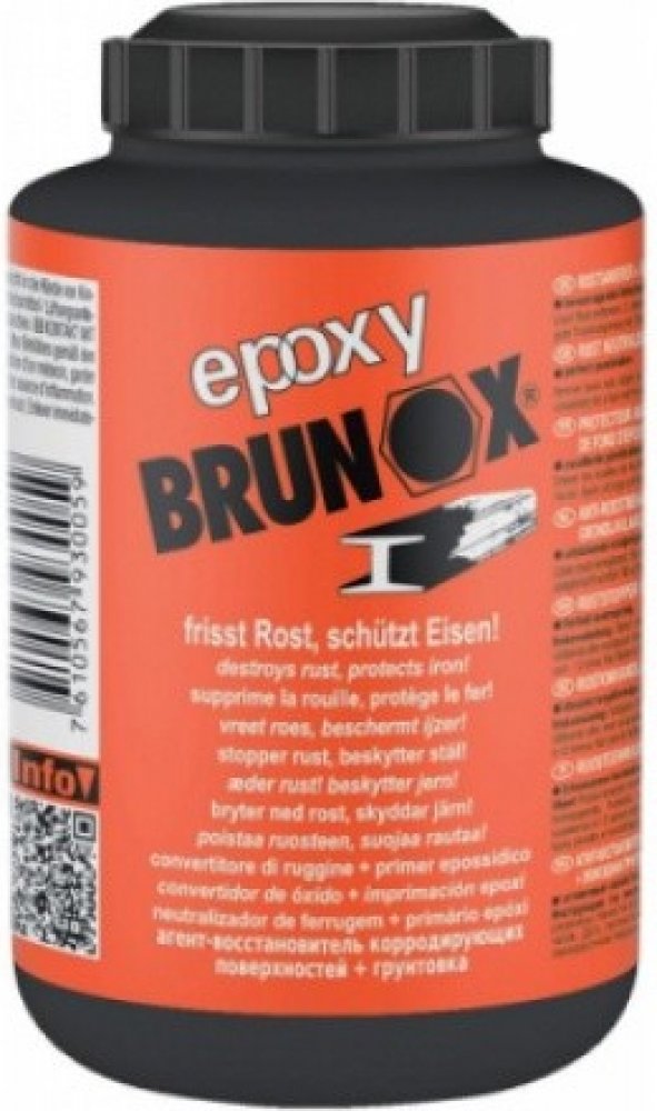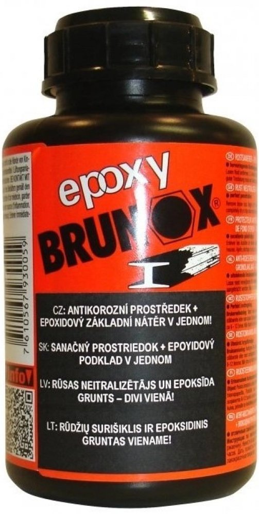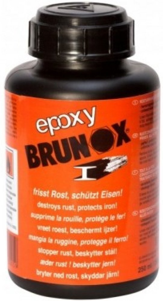 Brunox Epoxy je přípravek na základě epoxidových pryskyřic, určený pro sanaci rzi. Čirá tekutina koňakové barvy vytváří na povrchu s neutralizovanou vrstvou rzi kovově organický železitý celek. Nově vytváří černou celistvou a odolnou ochrannou vrstvu. Poskytuje tak dlouhotrvající ochranu před korozí a současně díky obsahu epoxidových pryskyřic vynikající podkladovou vrstvu, bez nutnosti používání základových laků. Výborně proniká do pórů rzi a vytváří perfektní vrstvu tenkého filmu beze stop po štětci a poskytuje možnost dalšího zpracování.