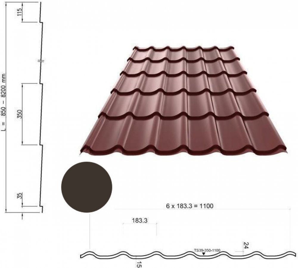 Monterrey Premium je střešní krytina vyrobená v nejvyšší třídě kvality Ruukki 50+, která se vyznačuje mimořádnou odolností vůči otěru a povětrnostním vlivům. Technické údajeCelková výška: 39 mmDélka vzoru: 350 mmEfektivní šířka: 1100 mmCelková šířka: 1180 mmMaximální délka: 8200 mmMinimální délka: 850 mmTloušťka materiálu: 0,5 mmHmotnost: 4,7 kg/m2 Minimální sklon střechyMinimální sklon: 9o