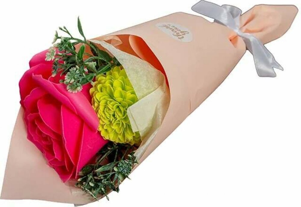 Elegantní mýdlová kytice s růží v růžové barvě společně se zelenkavou Chryzantémou v luxusně baleném pugétu doplněném o umělou zeleň, je originálním dárkem, který spojuje krásu květin, jemnou vůni a dlouhou trvanlivost. Květy jsou pečlivě zabalené do saténového obalu ve světle růžovém odstínu, vytvarovaného do stylového kornoutu. Celek je doplněn o luxusní zdobení umělou zelení a převázán 1,5 cm širokou bílou stuhou, která dodává mýdlové kytici nádech luxusu a originality. Celková délka kytice činí přibližně 30 cm a šířka 10 cm – ideální velikost, která zaujme na první pohled.