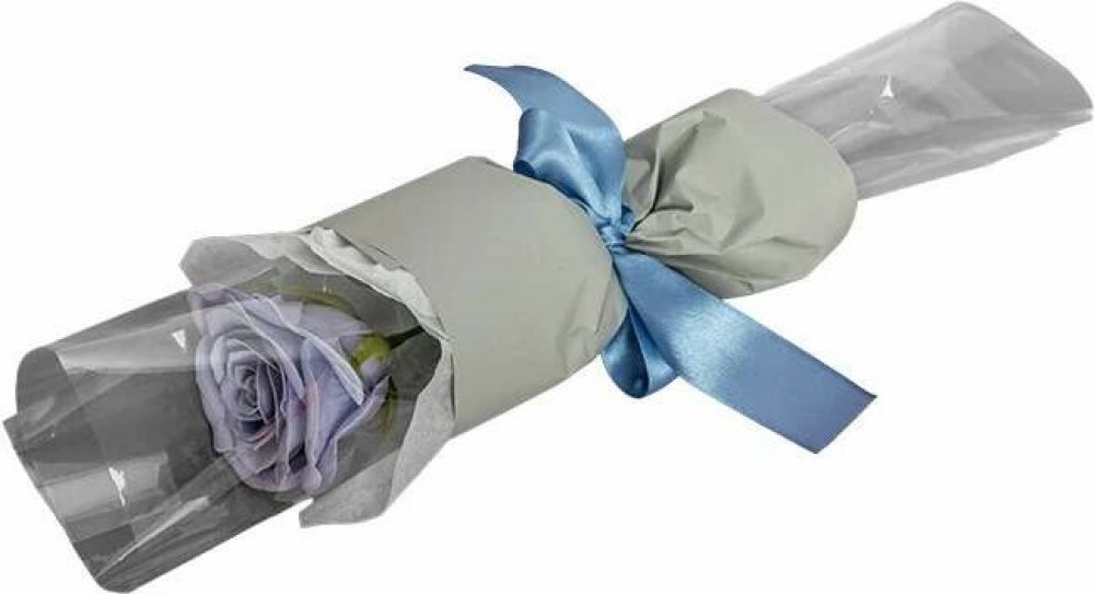 Úžasná kytice s ocelově modrou mýdlovou růží zabalená do pugétu, je originálním dárkem, který spojuje krásu květin, jemnou vůni a dlouhou trvanlivost. Celá mýdlová kytice je pečlivě zabalená do saténového floristického obalu šedé barvy a samotný květ je v průhledné fólii. Kytice je převázana 1,5cm širokou mašlí ve světle modré barvě, která dodává kytici nádech luxusu a originality. Celková délka kytice činí přibližně 30 cm a šířka 13 cm – ideální velikost, která zaujme na první pohled.