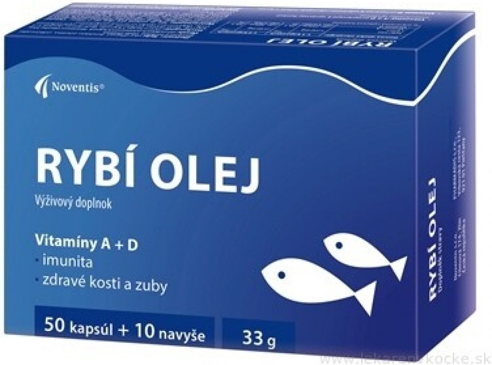 Rybí olej je doplněk stravy ve formě měkkých želatinových kapslí. Rybí olej je přírodním zdrojem vitaminů A a D a nenasycených mastných kyselin.Vitamin A přispívá k udržení normálního stavu sliznic, pokožky a zraku a podporuje imunitní systém.Vitamin D podporuje normální stav kostí a zubů, normální činnost nervové soustavy, udržení psychické činnosti a napomáhá funkci imunitního systému.V rybím oleji jsou však kromě kombinace vitamínu D a A obsaženy také nenasycené mastné kyseliny, které si naše tělo nedokáže vyrobit samo.Vitamíny A + D.Imunita.Zdravé kosti a zuby.Balení obsahuje 60 kapslí. Hmotnost obsahu 33 g.