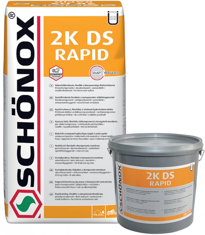 Hydroizolace 2K DS RAPID je vodonepropustná hmota s možností překlenutí trhlin na bázi cementu a speciální akrylátové disperze. Po smíchání 12,5 kg práškové směsi (s redukovanou prašností) a 5,0 kg disperze je hmota připravena pro zpracování. Tato hydroizolace je vhodná pro vnitřní i vnější prostředí.