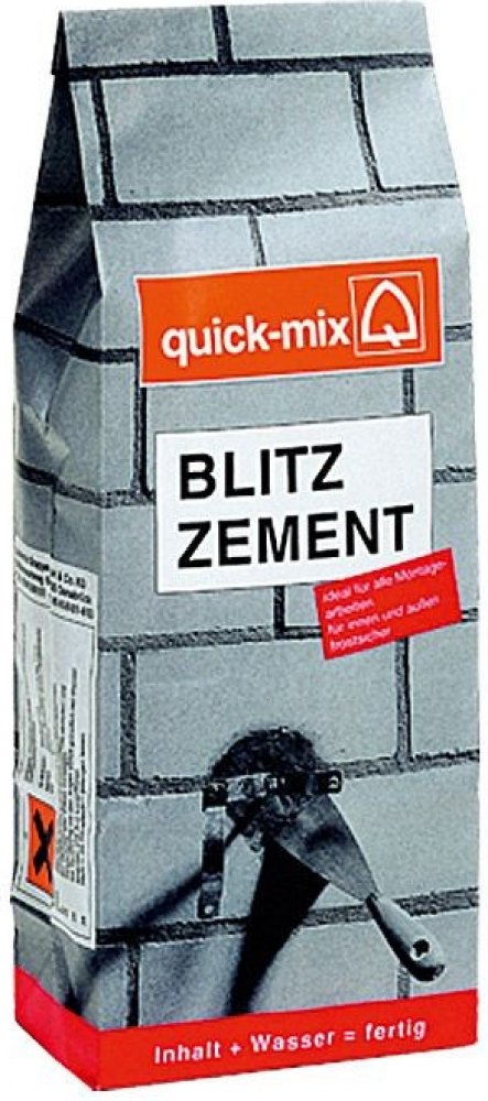 Bleskový cement od značky Quick-Mix se skvěle hodí k rychlé a bezpečné aplikaci hmoždinek, ke kotvení a upevňování háků do stěn, konzol, regálů, světel, radiátorů a elektroinstalace. Tento rychletvrdnoucí cement můžete dále použít při neodkladných opravách betonu nebo k ucpání míst ve stěnách, v nichž došlo k průniku vody. Můžete jej zatížit již po několika minutách, poté se stává voděodolným a mrazuvzdorným. Počátek tvrdnutí cca po 2 minutách v závislosti na teplotě a vlhkosti prostředí.