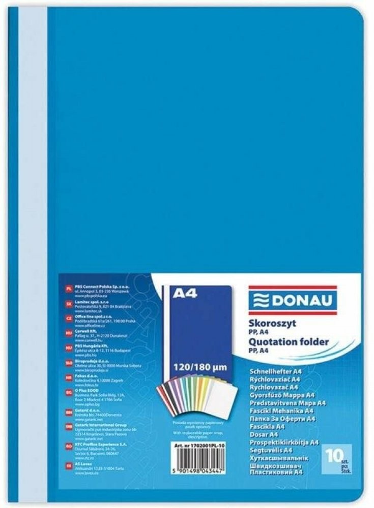 Chodíte často na schůzky a nosíte s sebou za každého počasí mnoho poznámek a papírů? Máte rádi organizovaný pořádek ve svých dokumentech?Chodíte často na schůzky a nosíte s sebou za každého počasí mnoho poznámek a papírů? Máte rádi organizovaný pořádek ve svých dokumentech? Tmavě modré plastové desky s rychlovazačem z řady DONAU vám pomohou tyto situace hravě zvládnout. Výhodou desek je především snadné ukládání dokumentů, možnost si desky popsat a označit pomocí boční pásky. Klíčové vlastnostitmavě modré provedenísnadné ukládání dokumentů - až 200 listůboční popisovatelná páskaPřední strana: 110 µ PP, drsný povrchZadní strana: 180 µ PP